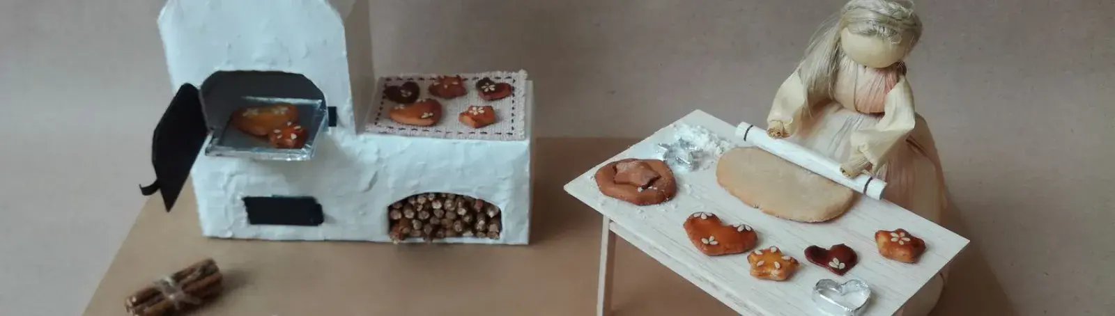 A Horgoló Csuhébaba kompozíciójával egy tipikus életképet szerettem volna megjeleníteni. A hímzés, horgolás rajongói előtt nem ismeretlen a szituáció, amikor este végre leülhetnek kicsit kézimunkázni, közben kikapcsolnak, átgondolják az elmúlt napot, a végén pedig öröm tölti el őket a kész alkotásban gyönyörködve. A baba kukoricacsuhéból készült, a kisasztal balsafából, a kiegészítők (könyv, bögre és kép) kartonból, a kis kosár rafiából. A horgolt terítőt sajnos nem én készítettem.