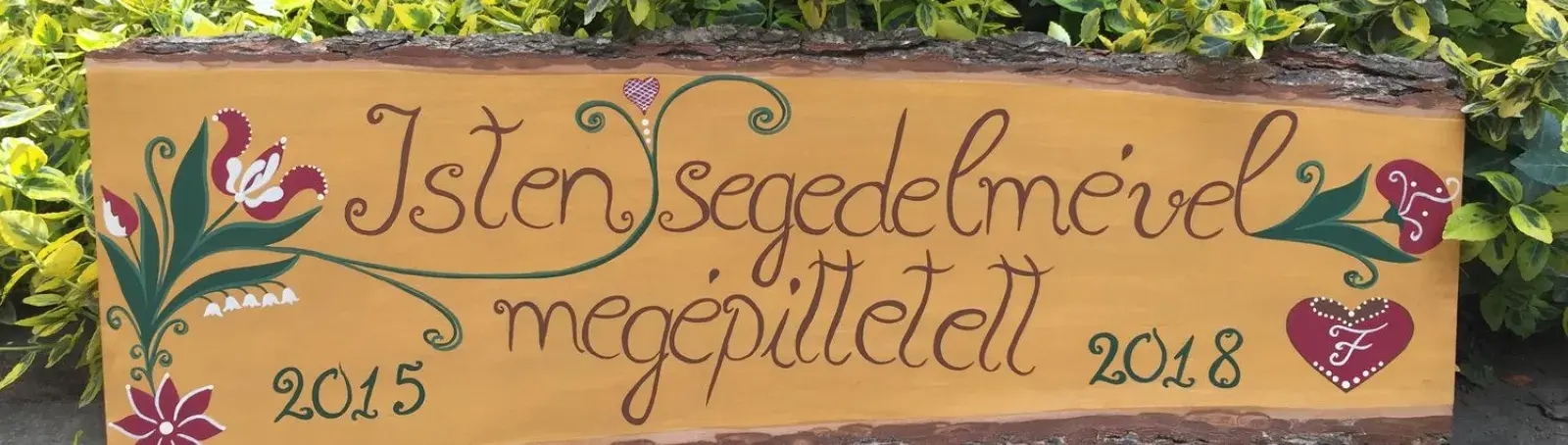 A pályázatra beküldött darab megrendelésre készült. Egy újonnan épült családi ház homlokzatát fogja díszíteni. Habár megrendelésre készült darabról van szó, mégis megvolt az alkotói szabadságom, mert teljesen rám bízták a minták kiválasztását. A szöveget készen kaptam, és az volt a megrendelők kérése, hogy piros, fehér és zöld színeket használjak, egyébként szabad kezet kaptam. Eredetileg zöld lett volna a szöveg is, de végül a barna mellett döntöttünk, mert úgy találtuk, hogy beleillik az összképbe, de mégis kicsit kiemeli a feliratot.