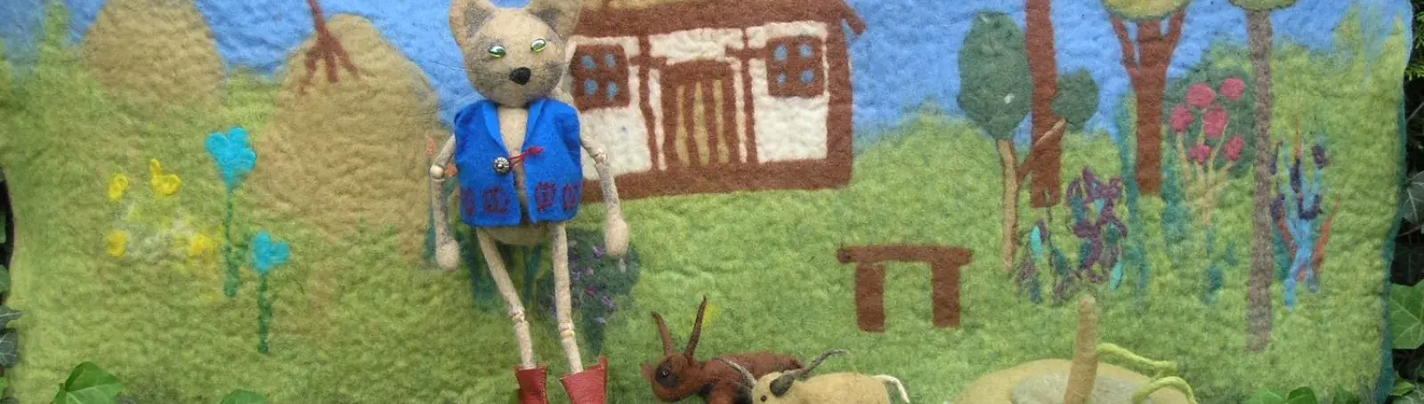 2020 februárjában végeztem a Hagyományok Háza akkreditált nemezkészítő tanfolyamán. A tanfolyamon készítettünk egy nemez-babát. Én egy cirmos cicát készítettem, kis mellénykével. Itthon, a gyerekeimnek a cicáról Móricz Zsigmond Iciri-piciri című meséje jutott eszükbe. Ezért készítettem a cicának egy pár csizmát, a két kis ökröcskét, tököt és hátteret, amin a vers színhelyei, a házikó, erdő, kaszáló megjelennek. Móricz gyerekkorát a Felső-Tisza vidékén töltötte, így Nagydobosi sütőtök mintájára készítettem az öblös tököt (lapos, kívül szürkészöld, belül narancssárga, teteje homorú), amiben a két ökör is elfér (egyik szürkemarha mintájára), a képen lévő lakóházat pedig a 19. századi milotai lakóház (vályogfalú, nádtetős, fa tartószerkezetű) alapján. A török kortól jellemző felkunkorodó orrú csizmát piros bőrből, barna bőrtalppal varrtam.